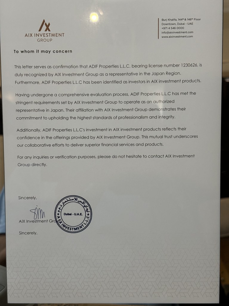 私がDubaiのAIX視察した件や、ADICO事業に関しまして