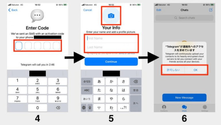 6.連絡先のアクセスを求められるが、Telegramを利用していることを他人(連絡先を登録している人)に知られたくない場合は「許可しない」を選択