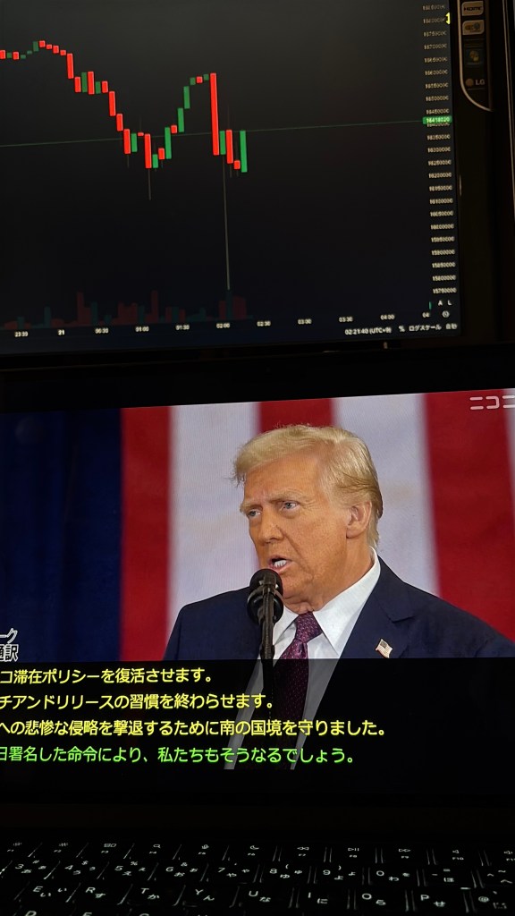 昨夜の(今朝?)せっかくなんで、どんな騒ぎを起こすか見てみようと思いトランプさんの就任式、各種チャート📈を並べて同時に見てみました。