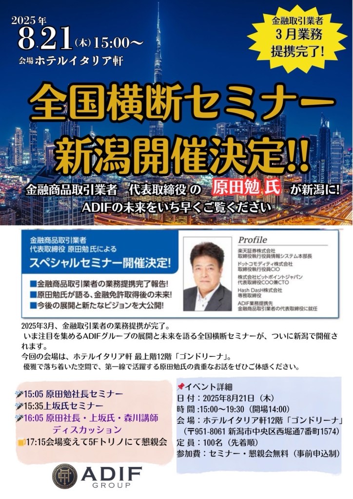 楽◯証券を作り上げた原田社長が今度はADIF (略称)社長として全国行脚中です。❣️